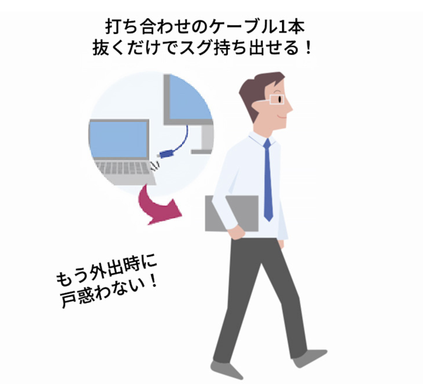 また、USBハブを2ポート搭載しているので、ノートPCに接続していたマウスやキーボード、WEBカメラなどをつなげておくことで、接続がスッキリします。打合わせはもちろん、出張や外出時も、ケーブル1本抜くだけですぐにPCを持ち出せます。