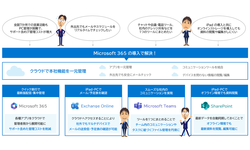 Microsoft 365 は、DX導入の初めの一歩に必要な機能がオールインワンで利用できる、クラウドベースの業務ツール・グループウェアです。